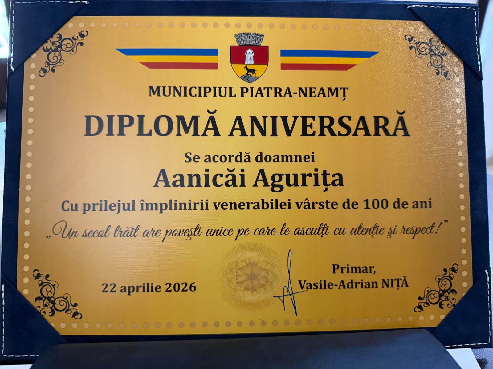 Am avut bucuria imensă de a-i trece pragul doamnei Agurița Aanicăi care a împlinit venerabila vârstă de 100 de ani.